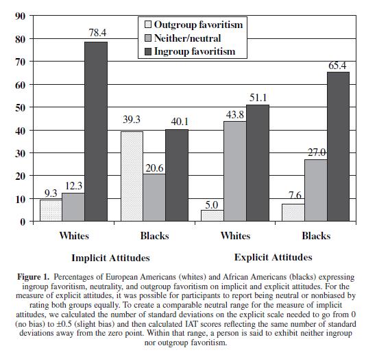 Data from a web-based project shows exactly the kind of effect that the authors propose in hypothesis 6′: despite similar patterns of explicit favouritism, we see quite a different story when we examine implicit attitudes. White participants demonstrate a preference for other whites, but black participants do as well. If simple ‘own-preference’ were the case, we’d see something quite different, with both groups tending to favour their own to the exclusion of the other. The fact that we see the observed pattern, not only in racial dynamics, but in terms of age (bias favouring young over old from both groups) and sexual orientation (bias favouring straight over gay from both groups), is strong support of the merit of the hypothesis.