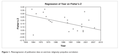 What we see is the latter case – as time passes and racism becomes more socially unacceptable generally, the association between religion and prejudice diminishes. Now while they plot a linear trend, there is no reason to conclude that religious people will become more racially tolerant than non-religious people. Extending the line that way goes beyond the descriptive ability of the test. What it does tell us though is that there are other factors that better explain racist ideologies than religious affiliation.