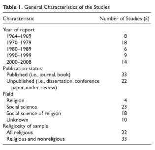 I’m a little bit wary of a meta-analysis in this case (partly because I can’t see the article; were the studies reviewed located in the same or different parts of the US, and did some of them explicitly seek out religious, conservative, or moderate subjects?).