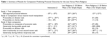 In all three studies, the main hypothesis was supported: compassion was a motivating factor in charitable giving in non-religious people; this effect was not seen (or was less pronounced) in religious people. Trait compassion in general predicted prosocial behaviour, such that those who described themselves as generally compassionate were more likely to help others regardless of their religious affiliation. In study 2 religious affiliation was associated with generosity, such that those who reported higher levels of religiosity were more likely to help others – this effect was not seen in the other two studies.