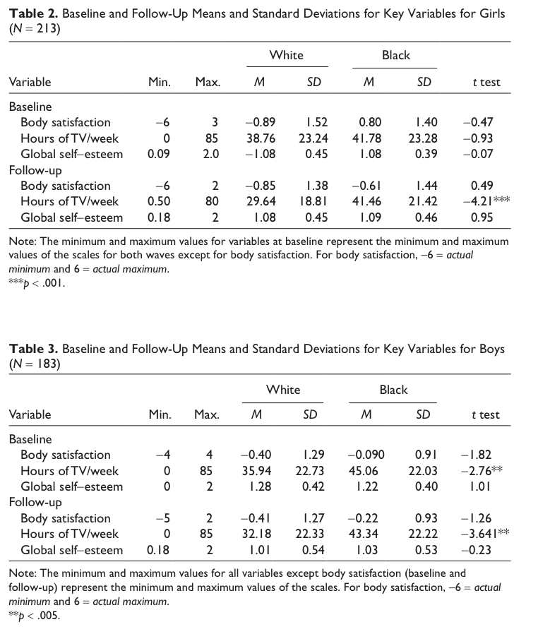 We can see from the above table that there are racial differences in the study variables observed between boys (white boys watched significantly less television at the second observation point) and girls (black girls watched more TV at both time points). There was no significant racial difference in self-esteem or body shape esteem.