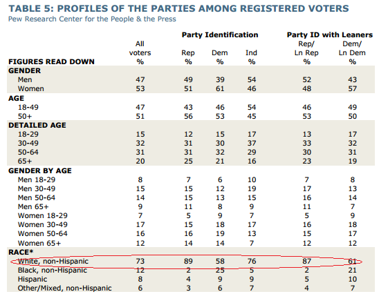 More recently, the good people at Pew looked at political party affiliation across a number of demographic factors, including race. The results are… perhaps not terribly surprising: