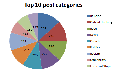 The above chart shows the breakdown of post tags. This is not an exhaustive list (obviously), nor are these categories mutually exclusive (the biggest example of this is “race” and “racism”, which often, but not always, appear together in the same post). I expected this chart to differ wildly from the one that I created after the first year of operation, but what I have instead seen is a gradual expanding of the blog’s topics rather than a sharp change in direction.